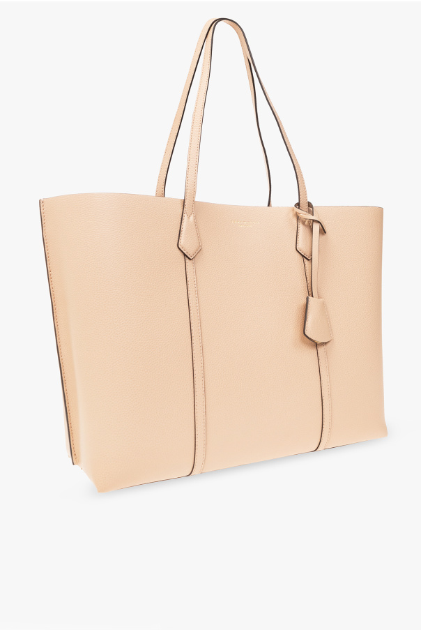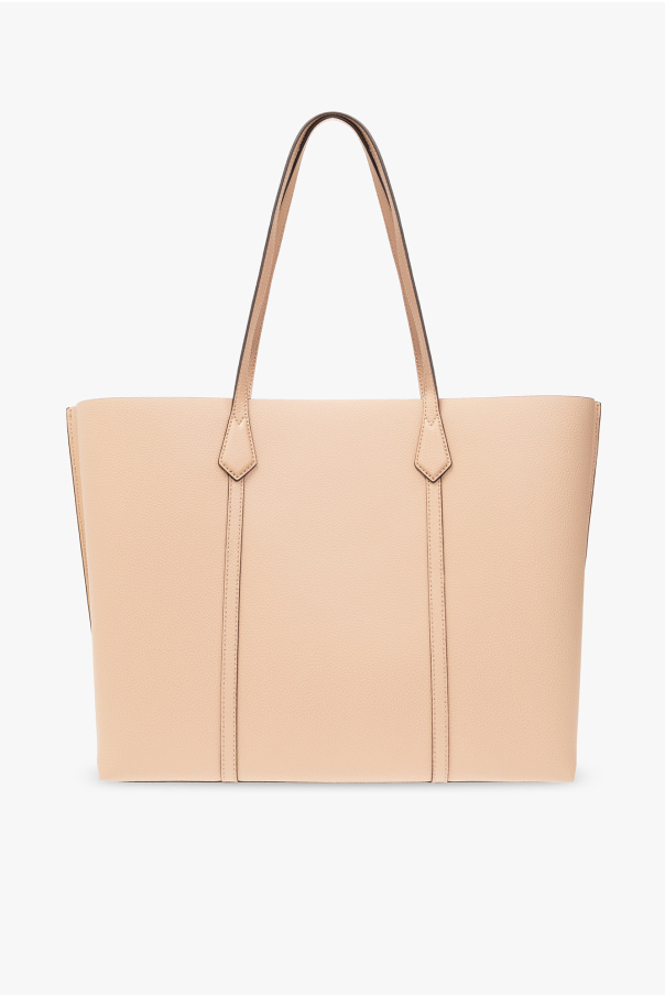 Beige ’Perry’ shopper bag from Tory Burch. Made of leather, this design fastens with a magnetic snap and is decorated with a gold-tone logo print. It is complete with two half-round handles, gold-tone metal hardware and two separate internal compartments with orange lining, one zip pocket and three card slots.