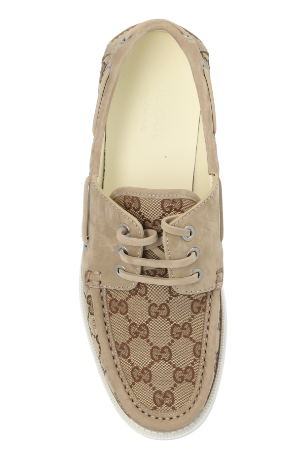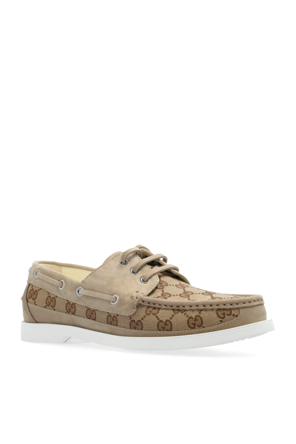 Introducing the epitome of luxury and refinement - the Monogram Deck Shoes by the esteemed designer, Gucci. These shoes are a harmonious blend of high-quality materials, showcasing an outer layer crafted from the finest leather and the iconic \'GG Supreme\' canvas. The distinctive monogram pattern, interlacing the brand\'s initials in a tasteful beige and brown palette, exudes sophistication and sets these shoes apart in the realm of luxury footwear. The shoes feature classic deck shoe elements, such as robust, contrasting white rubber soles for unparalleled grip and comfort, and traditional lace-up fronts with metal eyelets that underscore their nautical inspiration. The interior is lined with soft leather, and the insole proudly bears the Gucci name, ensuring every step you take is a statement of style and luxury. Whether paired with trousers and a jacket for a cohesive, elegant ensemble or worn as a standout piece, these Monogram Deck Shoes by Gucci are designed to elevate any outfit with their unmistakable luxury and impeccable craftsmanship. Why Purchase This Product? Exquisite blend of leather and \'GG Supreme\' canvas, showcasing Gucci\'s iconic monogram pattern. Superior comfort and durability thanks to the robust rubber soles. Timeless design with classic deck shoe elements, perfect for versatile styling. Emblematic of Gucci\'s renowned craftsmanship and attention to detail.