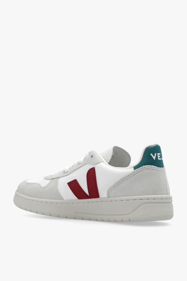 Light grey and white \'V-10 B-Mesh\' sneakers from Veja. Crafted from ‘B-Mesh’ derived from recycled bottles and suede, this lace-up pair sits on a beige rubber sole made of organic and recycled materials and is complete with an embossed logo on the tongue, green heel counter with a white logo print and maroon V patch made of rubber and rice waste. The mesh inner lining made from recycled materials was developed to acquire a better resistance to friction. The organic-sourced and recycled insole consists of sugar cane, Amazon rubber, organic cotton and recycled EVA. It is set on a beige rubber sole made from organic and recycled materials. The leather comes from farms in Rio Grande do Sul and is L.W.G. Gold certified by the Leather Working Group, which promotes sustainable practices that have a positive impact on the environment in tanneries.