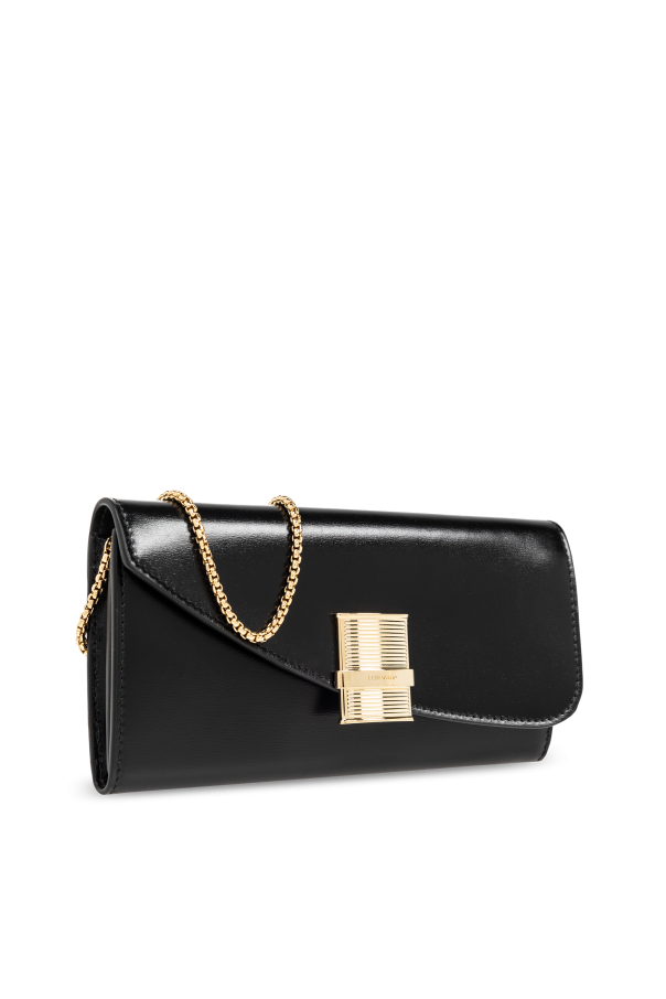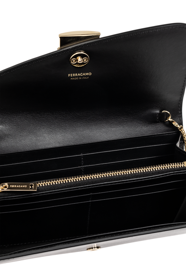 Introducing the epitome of sophistication and luxurious design - the FERRAGAMO Chain Wallet. Crafted with meticulous attention to detail, this exquisite accessory is fashioned from 100% premium black leather, boasting a sleek, rectangular silhouette that gleams with a subtle sheen. Its front panel is adorned with a distinctive gold zipper that serves not only as a secure closure but also as an elegant embellishment. This zipper is intricately engraved with vertical ridges, showcasing the designer’s logo, signifying authenticity and unparalleled craftsmanship. The wallet’s interior reveals a thoughtful arrangement of compartments, including a zippered pocket, ensuring all essentials are organized and easily accessible. It features two main compartments, six card slots, and an additional slip pocket, providing ample space for necessities. The discreetly placed designer logo within the wallet\'s interior enhances its minimalist design without overwhelming its refined aesthetic. Accompanied by a golden chain, this wallet transcends conventional functionality, allowing for versatile carrying options that cater to the modern woman\'s dynamic lifestyle. Its proportion and size, demonstrated against the backdrop of light attire in one of the photographs, affirm its suitability and appeal as a statement piece for those who value elegance, quality, and design. Why Choose This Product? Exclusivity and elegance encapsulated in 100% high-quality leather. Functional beauty with its gold zip closure and matching chain. Organizational ease with two compartments, six card slots, and more. Subtle branding through a discreet designer logo, affirming authenticity. A versatile accessory that complements any outfit, making it perfect for every occasion.