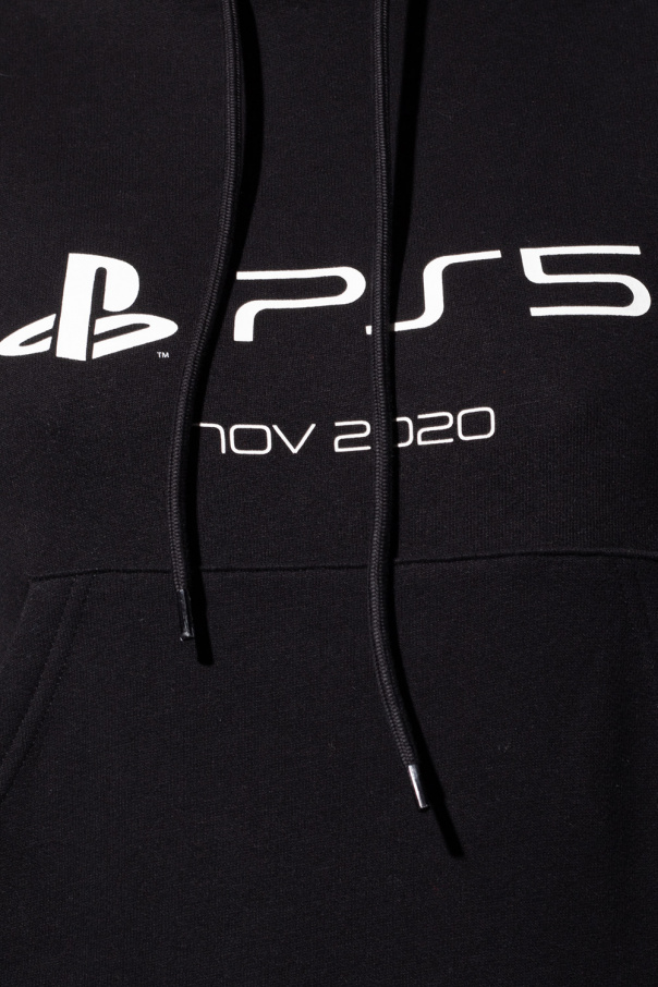 Black sweatshirt with a drawcord-adjustable hood from Balenciaga x PS5. Crafted from cotton jersey, this hoodie features a white graphic print with the brand\'s logo, a kangaroo pocket and ribbed trims on the edges.