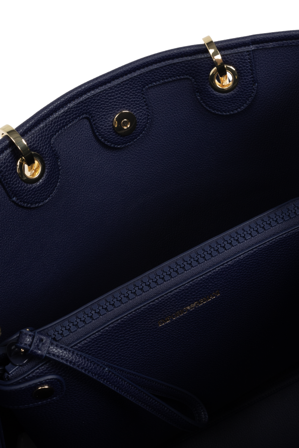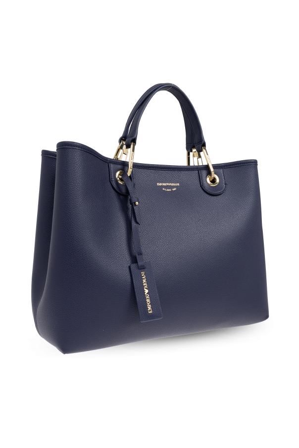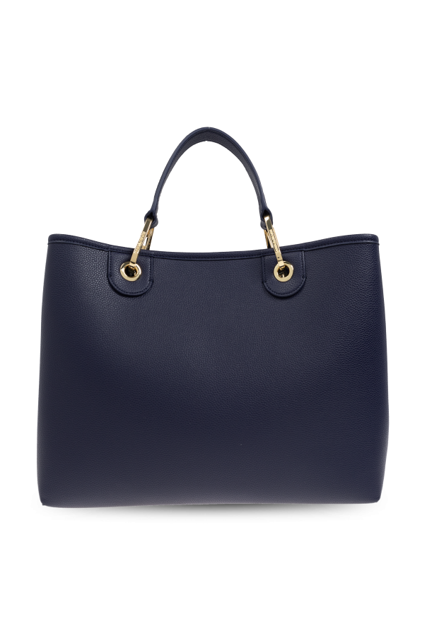 Introducing the exclusive Emporio Armani Shopper Bag, a quintessential blend of elegance and functionality. Crafted from high-quality, grainy navy leather, this bag epitomizes timeless sophistication and durability, ensuring it withstands the rigors of daily use. The bag features a classic rectangular shape with gently rounded edges, designed to provide ample space, characteristic of shopper bags. The gold accents, including hardware such as handle rings and zippers, add a touch of opulence, while the iconic EMPORIO ARMANI logo in gold on the front underscores its exclusive nature. Inside, you\'ll find a zippered pocket, enhancing its practicality, and an additional strap that allows for shoulder carrying. A unique detail includes a leather hanger with a metal plaque inscribed with \"EMPORIO ARMANI,\" further accentuating its luxurious appeal. The bag secures with a magnetic closure, providing both convenience and security. Why Choose This Product? Exquisite design from the renowned Emporio Armani Constructed from premium, grainy navy leather Features gold hardware and branding for a luxurious touch Spacious interior with a zippered pocket for added functionality Versatile carrying options with an additional shoulder strap Secure magnetic closure for ease and safety
