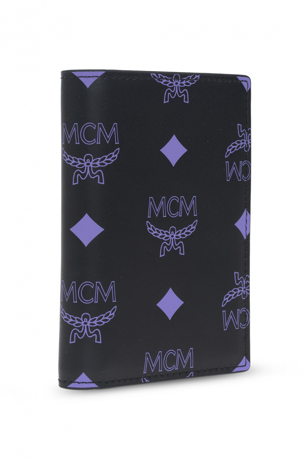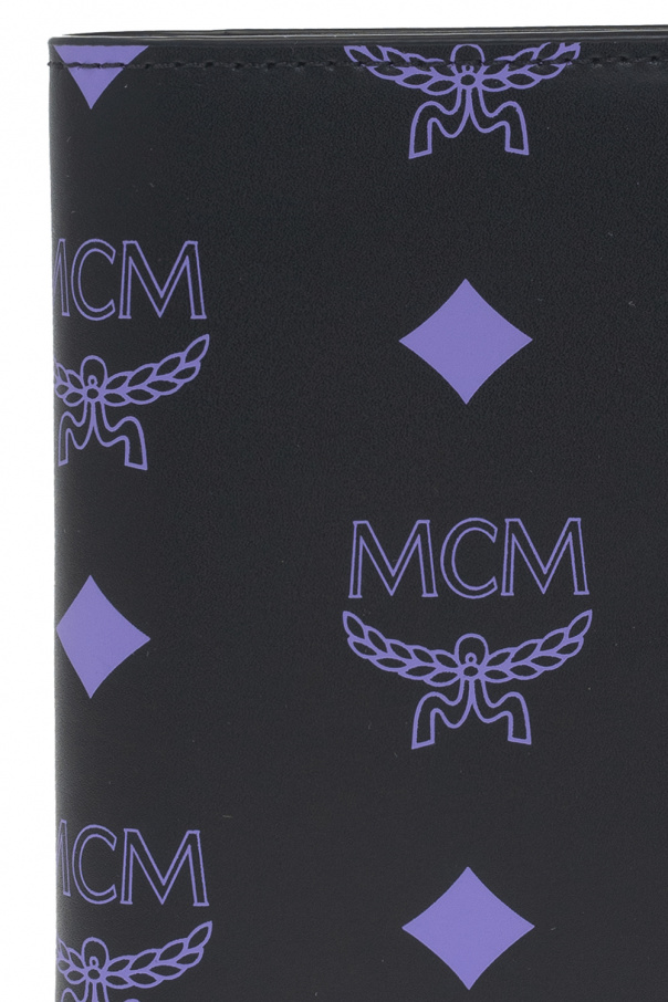 Black wallet from MCM. Embellished with a light purple logo motif, this design features a snap fastening and a zipped coin pocket, two slip pockets, eight card slots and a bill compartment inside.