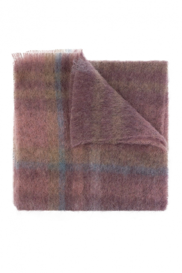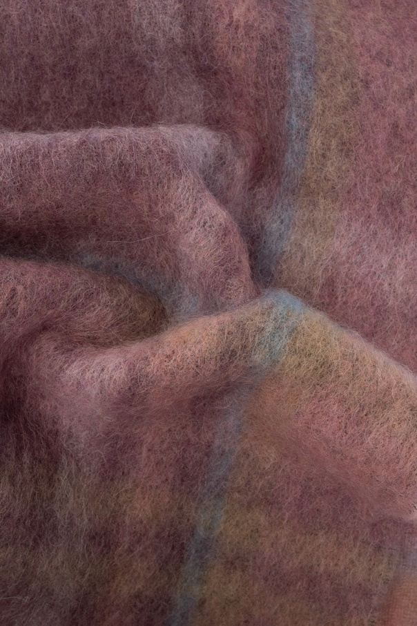 Pink, blue and cream scarf from Acne Studios. Crafted from a wool, mohair and alpaca wool blend, this item showcases a white and black logo patch and raw edges.