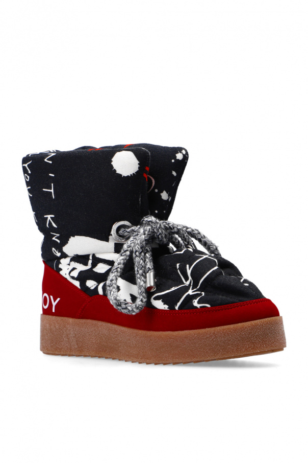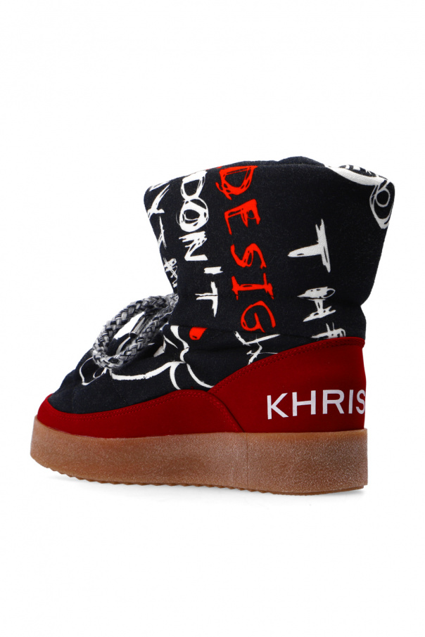 Black and red snow boots from Khrisjoy. Decorated with a pattern, this lace-up pair features a white logo printed at the back and a brown rubber sole.