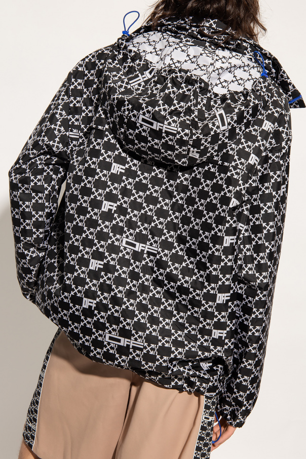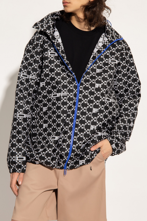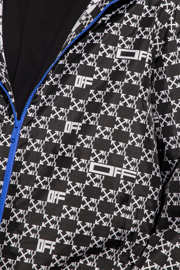 Black and grey hoodie from Off-White. Fastened with a dark blue zip, this garment features a high neck, printed Arrows pattern, drawstring hood and hem, two slip pockets and long sleeves with ribbed cuffs.