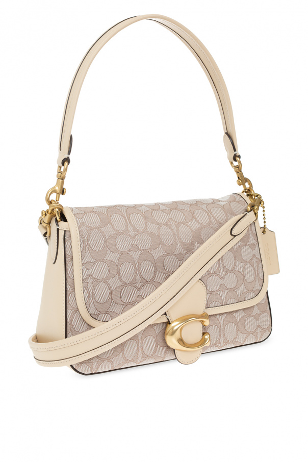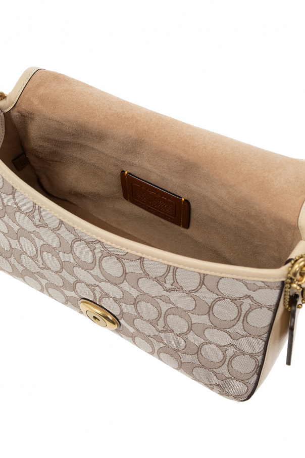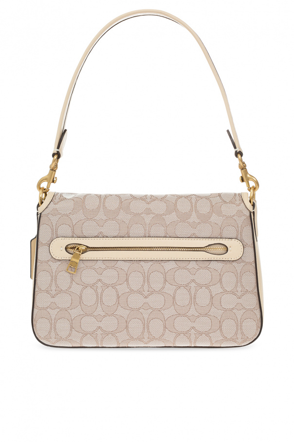 Cream and brown ‘Sig Jaq Soft’ shoulder bag from Coach. Crafted from monogrammed canvas, this design secures with a snap and features leather trims, a metal logo plaque on the front, a back zip pocket, a half-round handle, a detachable and adjustable shoulder strap, gold-tone metal hardware and one internal compartment with a zip pocket.