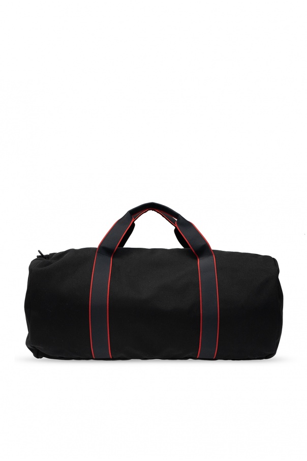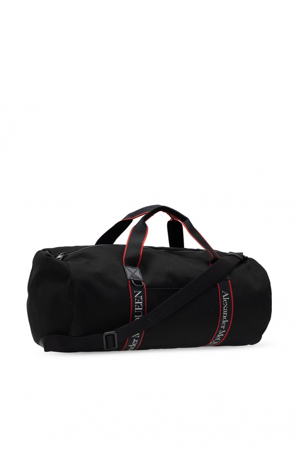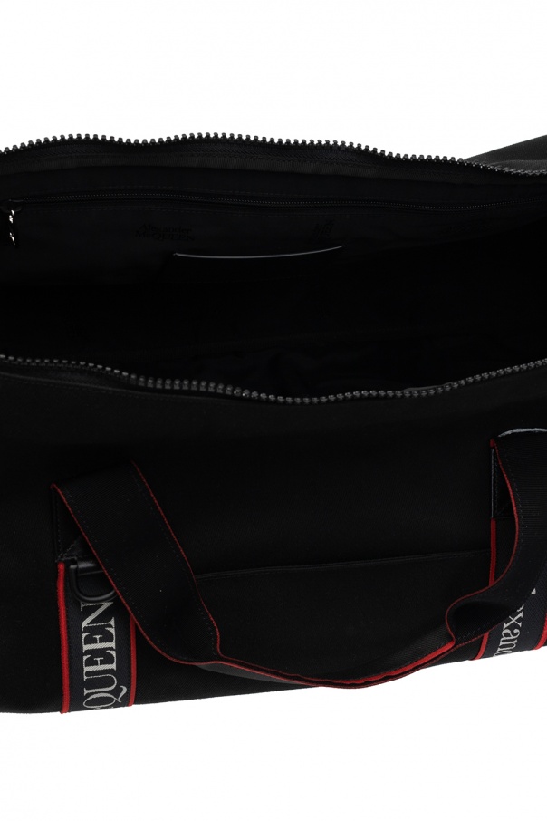 Black holdall bag from Alexander McQueen. Fastened with a zip, this design features a zip fastening, white, red and black side stripes with logo details, two half-round handles, one slip pocket, shoulder strap and one internal compartment with one slip pocket and one zip pocket.