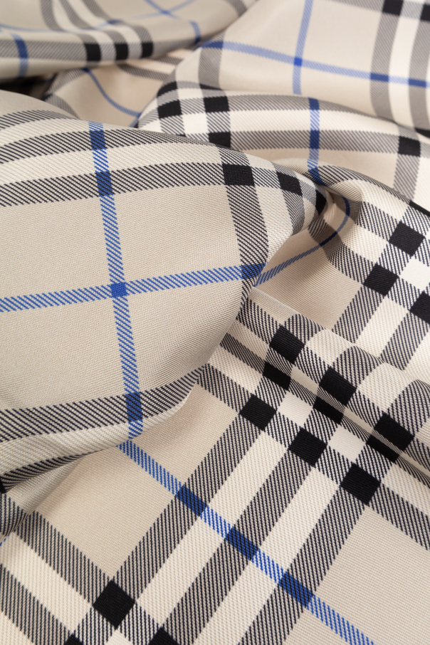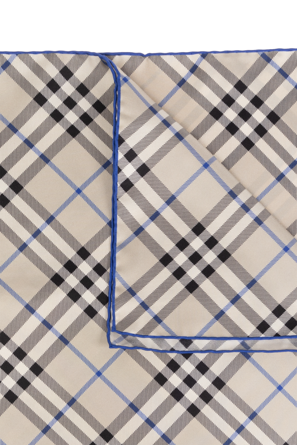Grey, white and blue shawl from Burberry. Made of silk, this item showcases the brand\'s signature check motif and piping on the edges.
