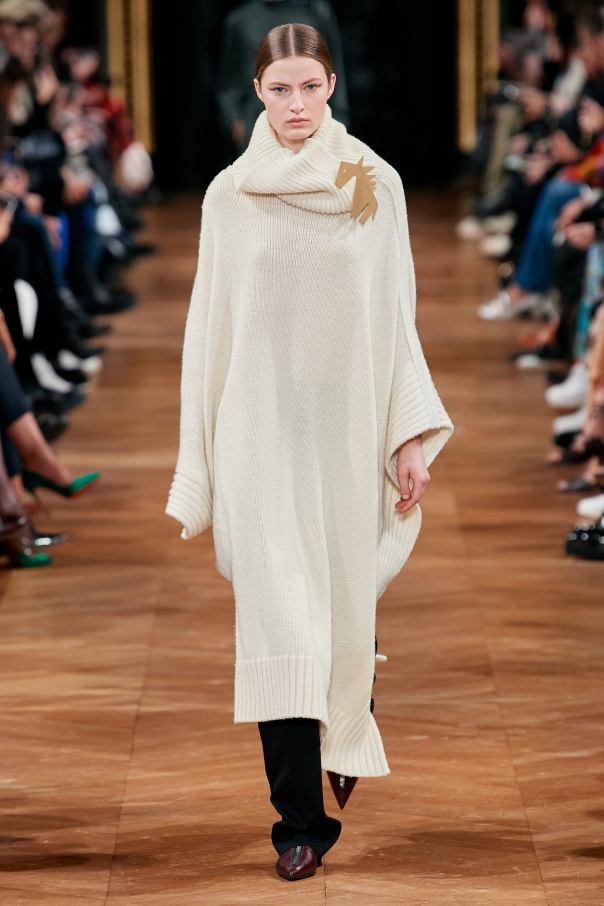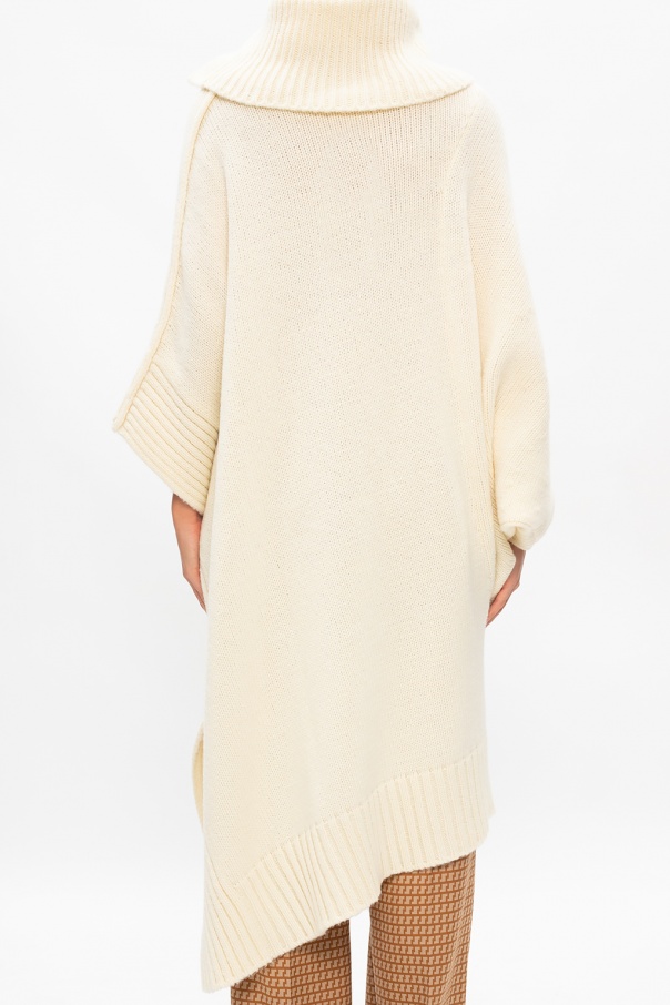 Cream poncho from Stella McCartney. Knitted from a wool blend, this garment is distinguished with a high collar fastened with snaps.