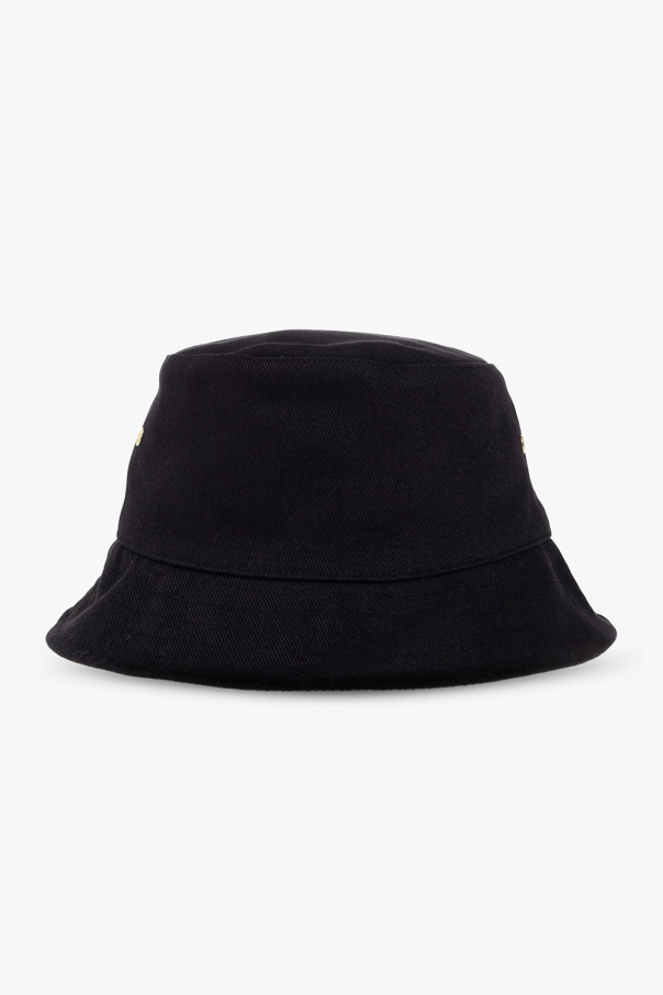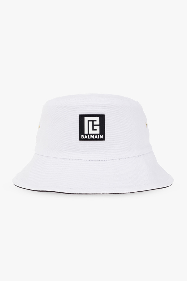 Black bucket hat from Balmain. Made of cotton, this item features a rubber logo application in white.