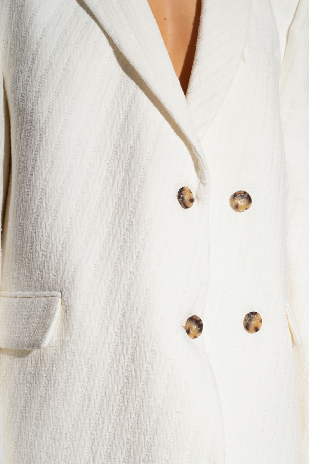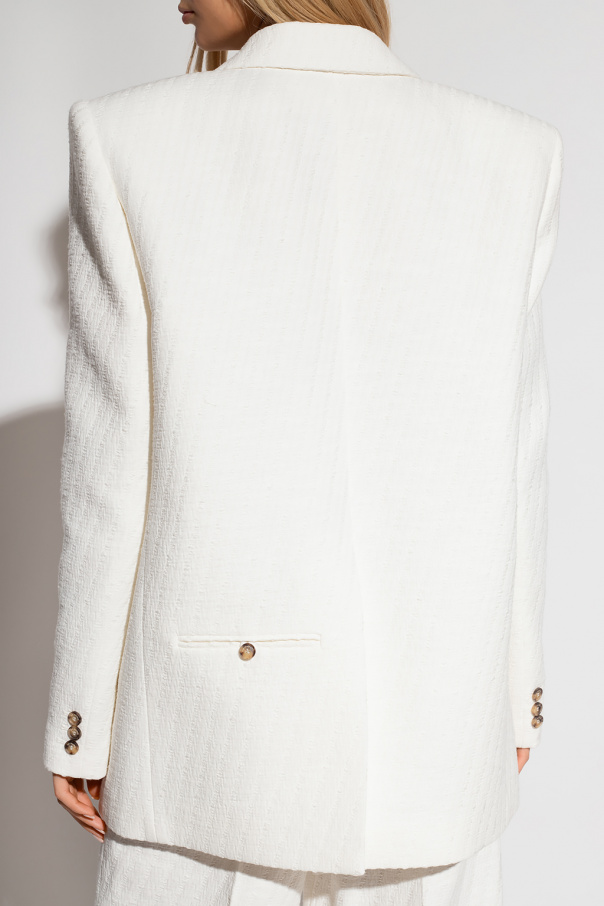 White ‘Antony’ double-breasted blazer from The Mannei. Crafted from textured cotton, this design features an embossed pattern, buttoned fastenings, two flap pockets, one slip pocket, peak lapels, single rear vent and long sleeves with padded shoulders and button cuffs.