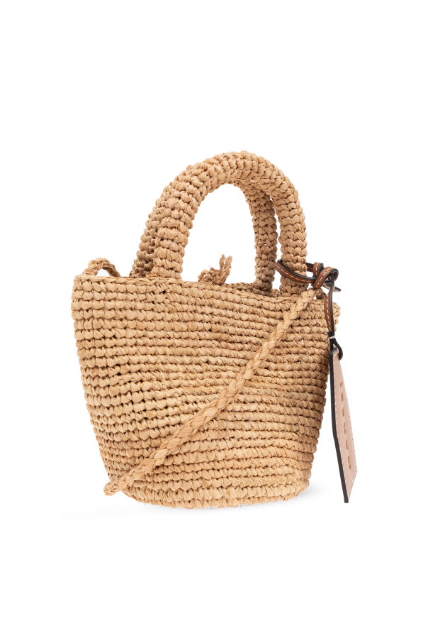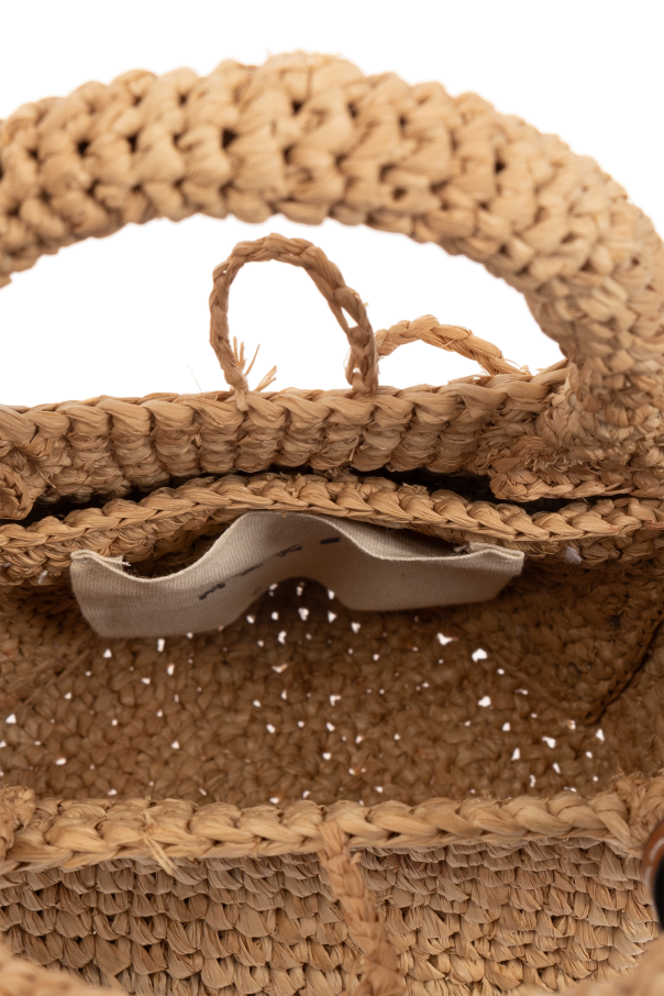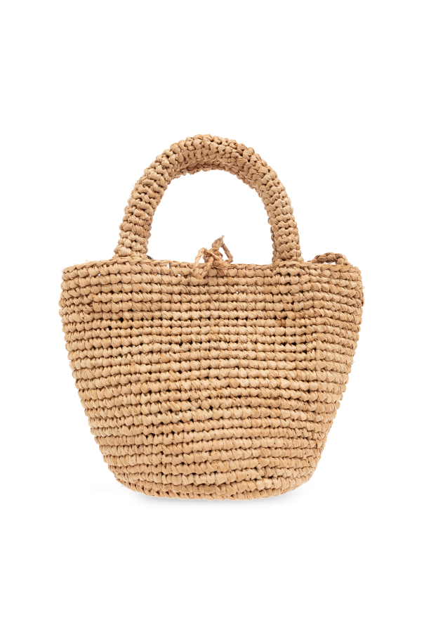 Beige ‘Summer Mini’ shoulder bag from Manebi. Hand-woven from natural raffia by local women from Madagascar, this design cinches closed with drawstrings and showcases a brown leather patch with an embossed logo and signature palm motif, two half-round handles as well as a shoulder strap and one internal compartment with a card slot. *Due to the artisanal nature of the product, individual pieces may vary slightly.