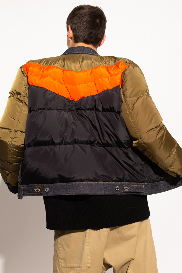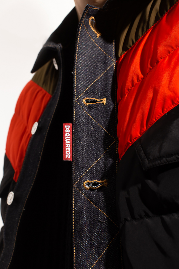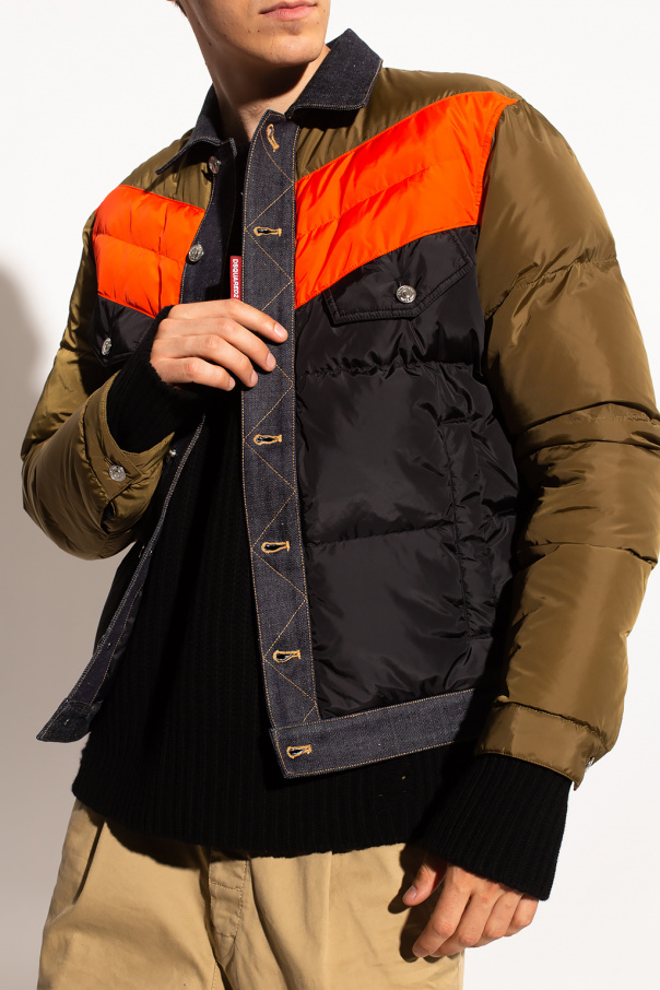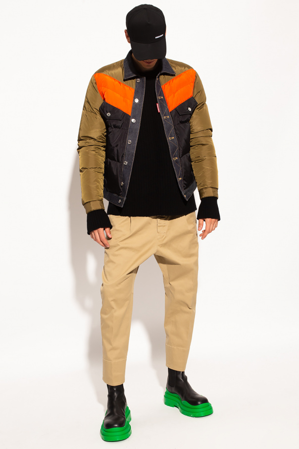Green, orange and black quilted jacket from Dsquared2. Fastened with buttons, this pair features two zip pockets, two buttoned flap pockets, navy denim trims and long sleeves with buttons.