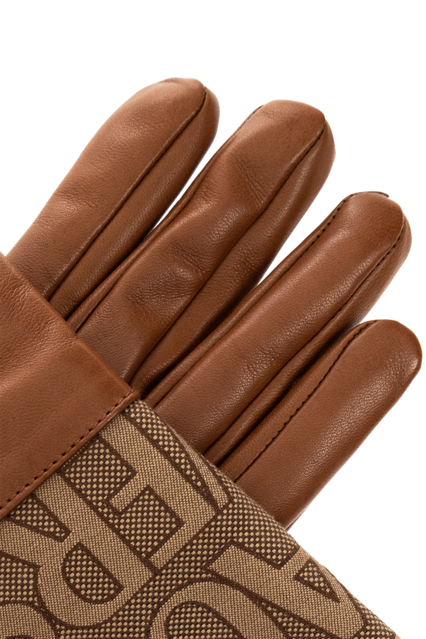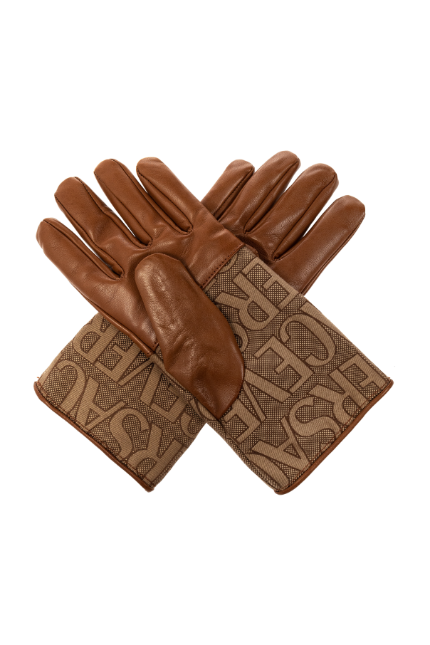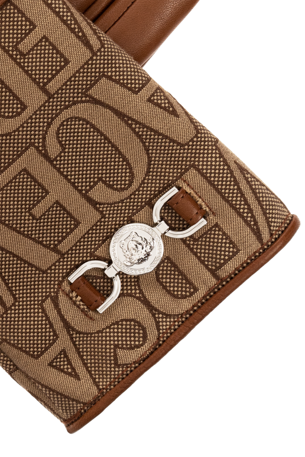 Beige and brown gloves from Versace. Made of canvas with a jacquard logo pattern and lamb leather trims, this design features a Medusa head in silver-tone metal and lining crafted from cashmere.
