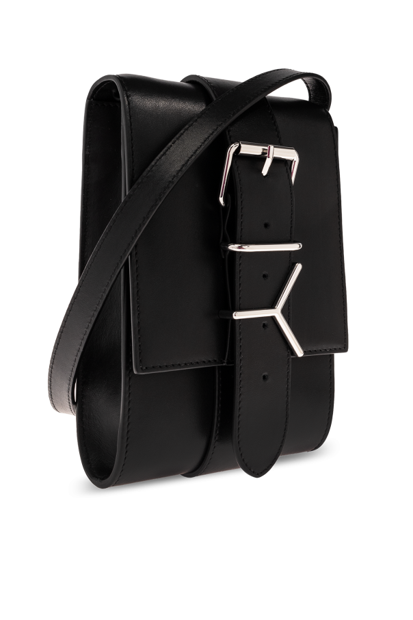 Black ‘Y Belt’ shoulder bag from Y Project. Made from leather, this design fastens via a snap and showcases a metal logo plaque on the flap, silver-tone metal hardware, one internal compartment with a card slot as well as a detachable and adjustable shoulder strap.