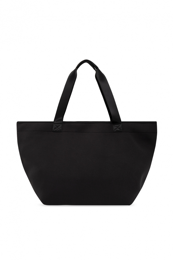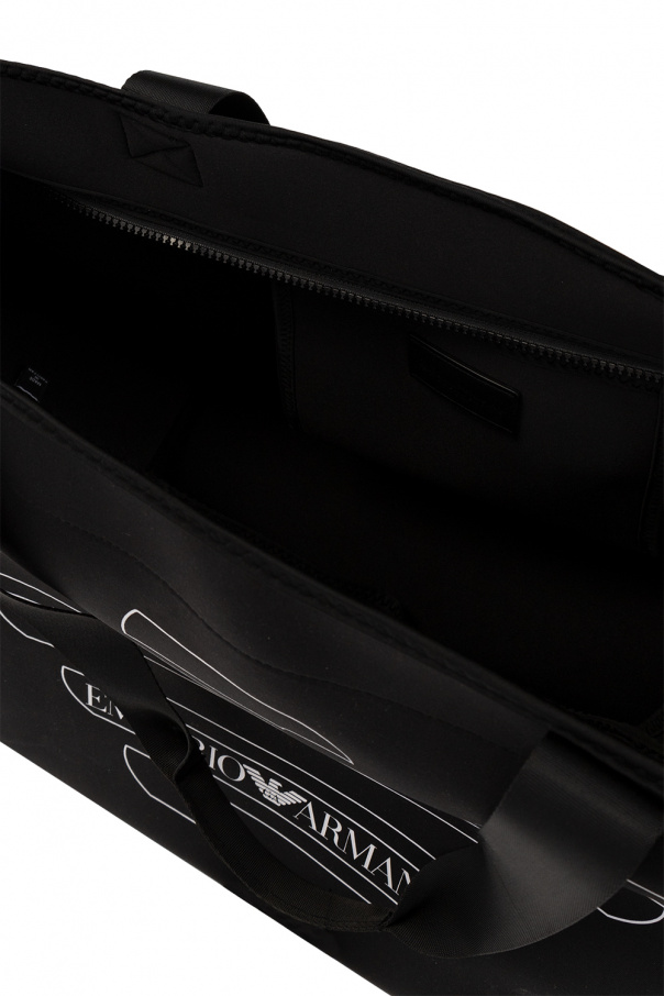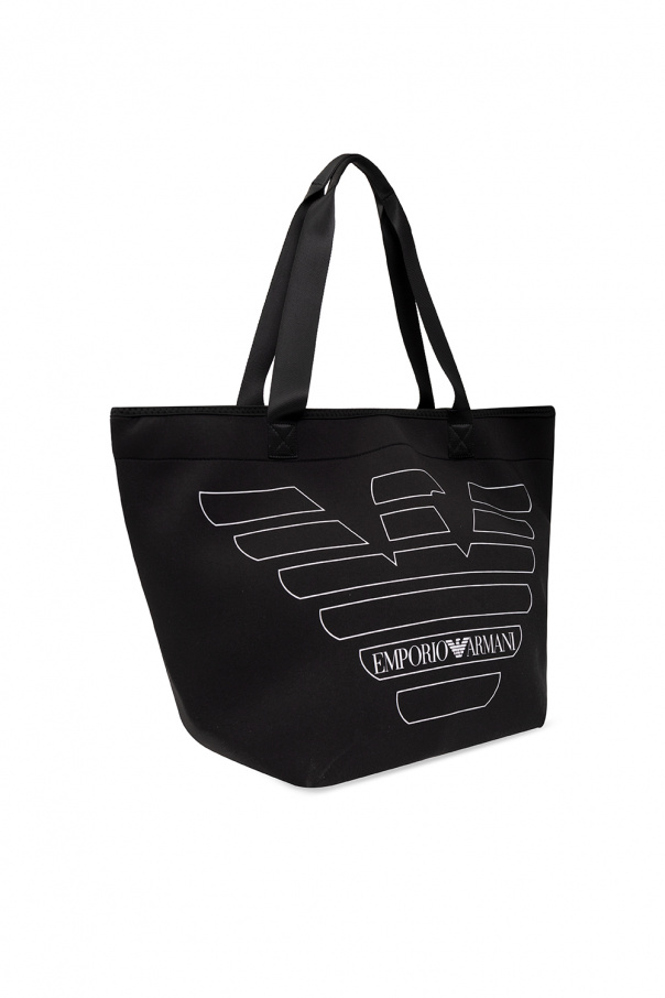 Black beach bag from Emporio Armani, the ‘Swimwear’ collection. Fastened with a zip, this model features a white logo print, two half-round handles, silver-tone metal hardware and one internal compartment with one slip pocket.