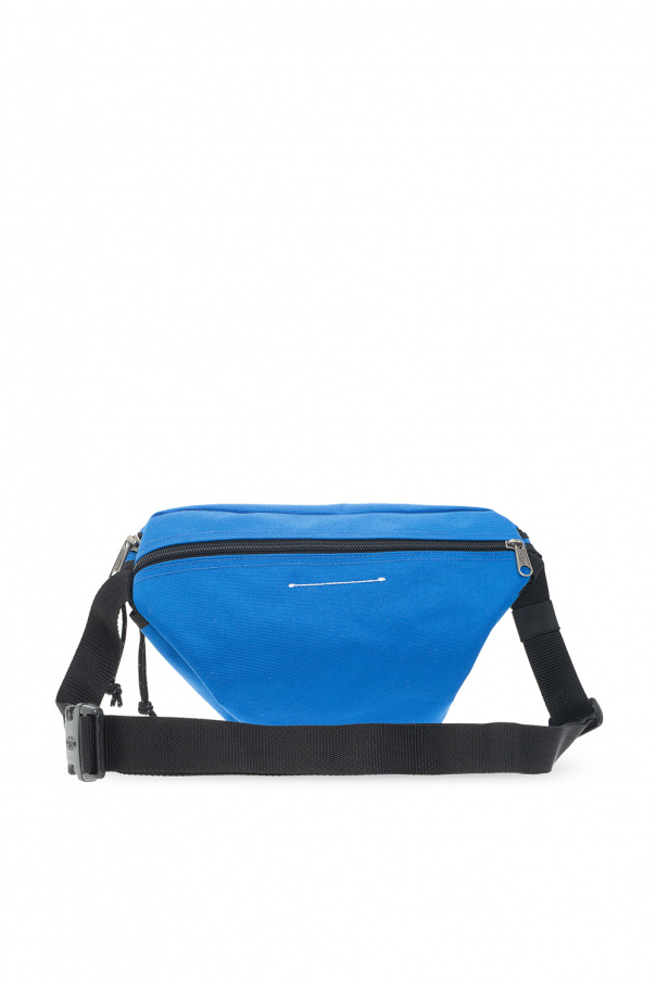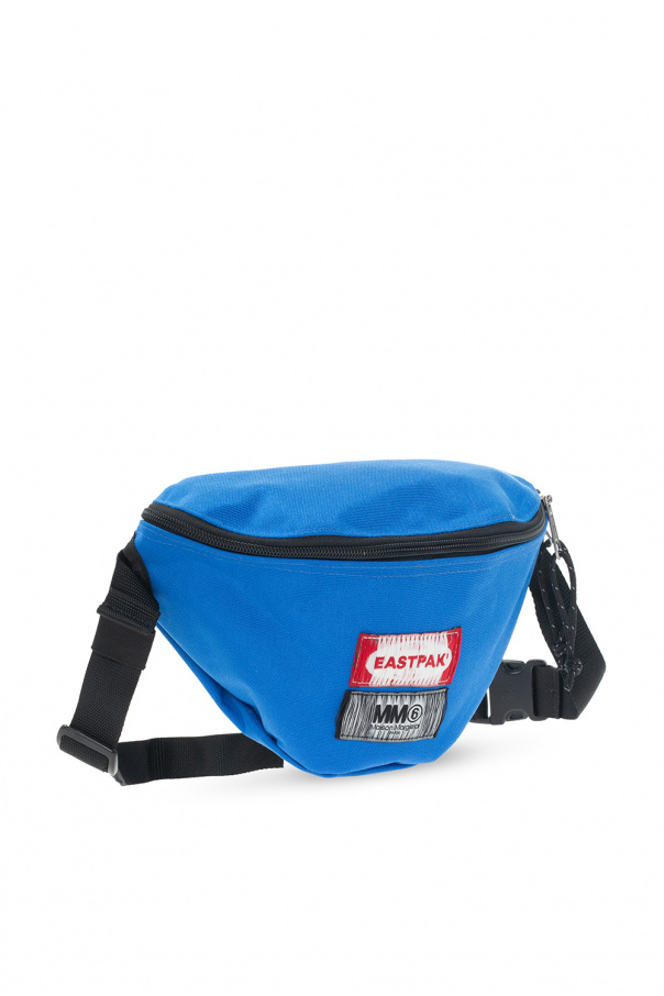 Belt bag from MM6 Maison Margiela x Eastpak. Emblazoned with a logo patch, this design features a two-way zipper, an adjustable strap and silver-tone metal hardware. It reverses between a white and black side with one internal zipped pocket and a blue side with a back zipped pocket.