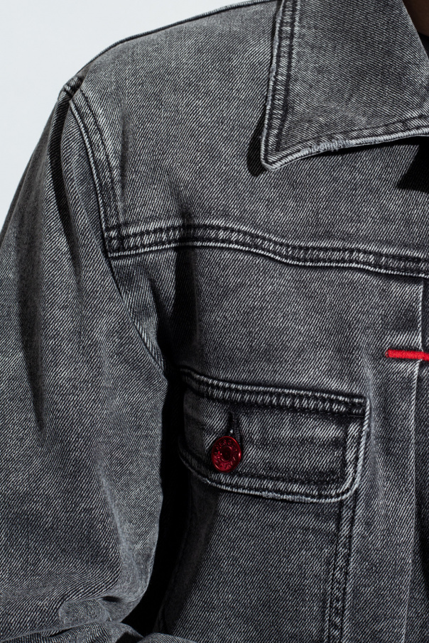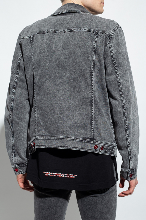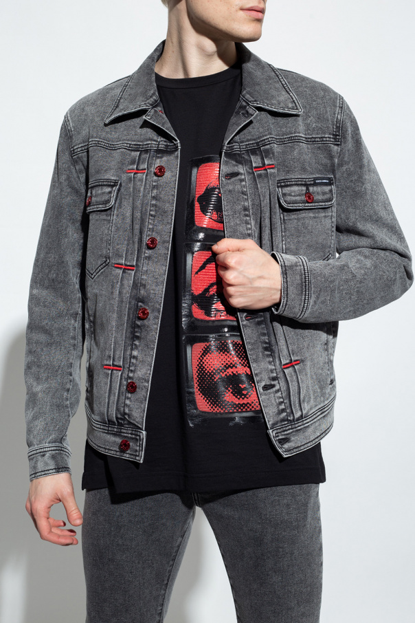 Grey denim jacket from Dolce & Gabbana. Accentuated with red stitching details and red button closures, this style features two snap-fastened pockets and two flapped pockets with buttons on the front, and long sleeves with button cuffs.