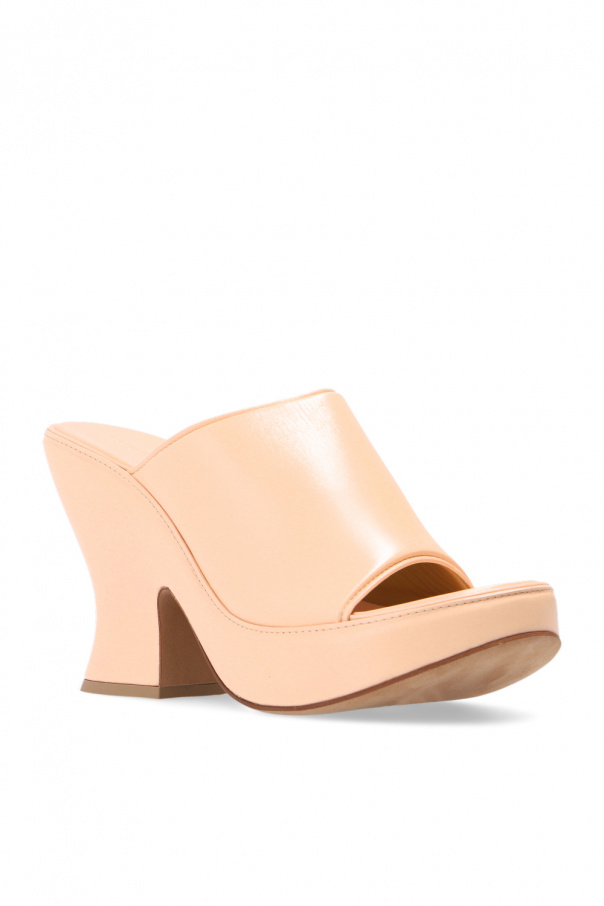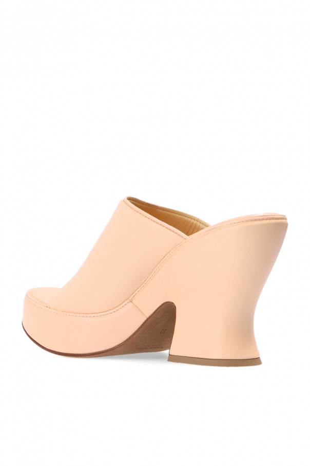 Blush pink heeled mules from Bottega Veneta. Crafted from lamb leather, this open toe design rests on a beige leather sole.