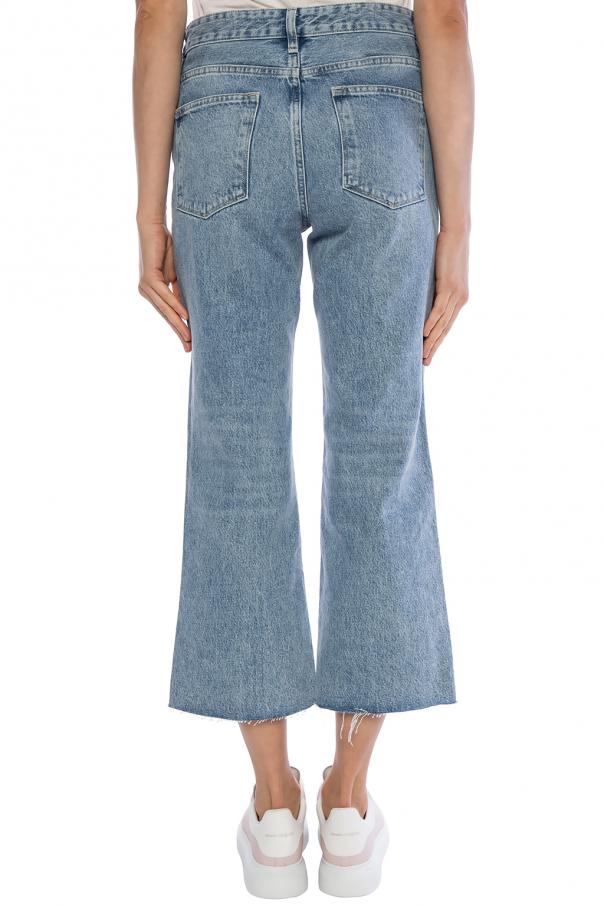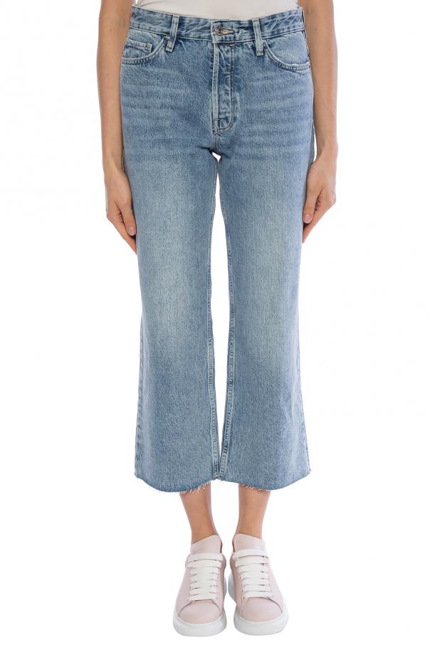 Blue ‘Helle’ jeans from AllSaints featuring button fastening, 4 slip pockets, cropped legs with frayed cuffs.