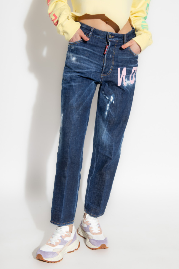 Dark blue ‘Boston’ jeans from Dsquared2. Falling with tapered legs, this pair features button closures, classic five pockets, distressed detailing and a printed light pink logo.