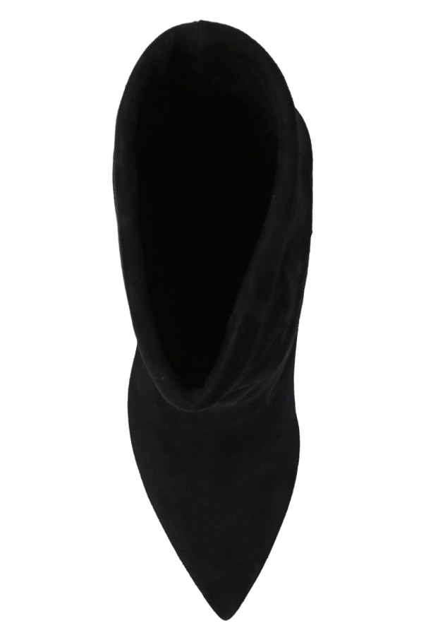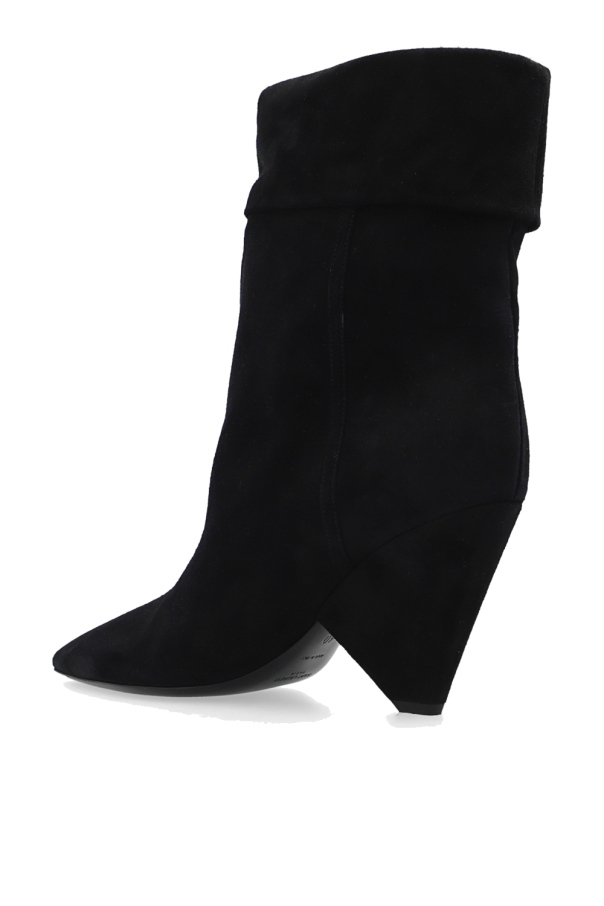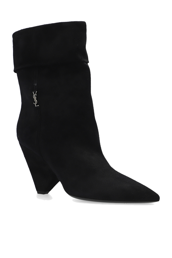 Black ‘Niki’ heeled ankle boots from Saint Laurent. Resting on a black leather sole, this slip-on pair features a metal logo appliqué, cone heel and black leather sole.