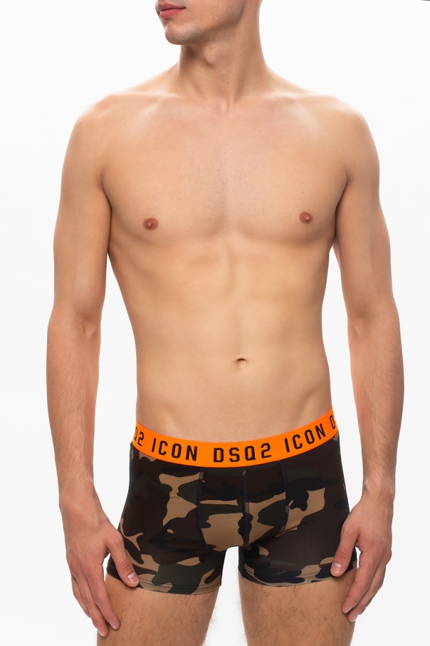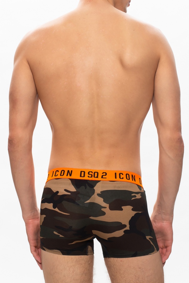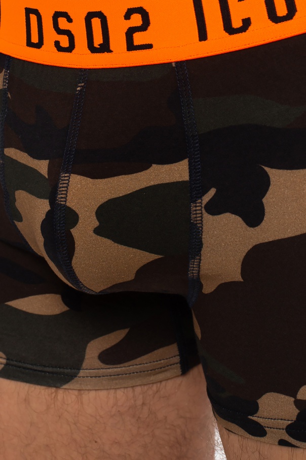 Green and brown boxers in camo motif from Dsquared2. Crafted from cotton, this pair is finished with an elasticated waistband embroidered with the label's logo in black and orange.