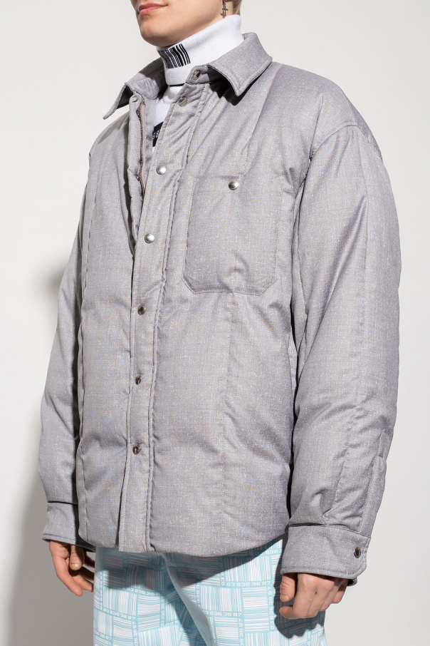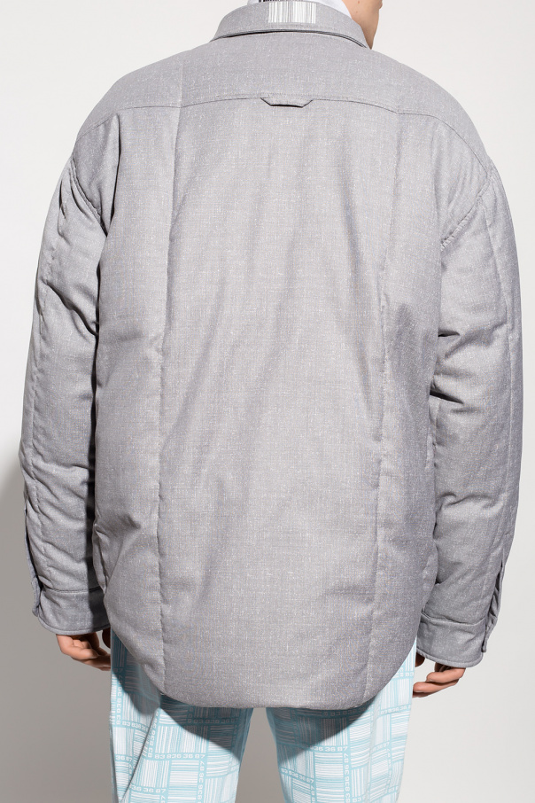 Grey asymmetrical shirt jacket from VTMNTS. Made of wool, this model features a two-way zip and snaps, collar with the label’s signature barcode in white, two zip pockets, snap-fastened pocket and long sleeves.
