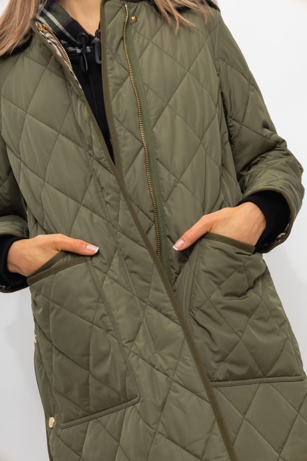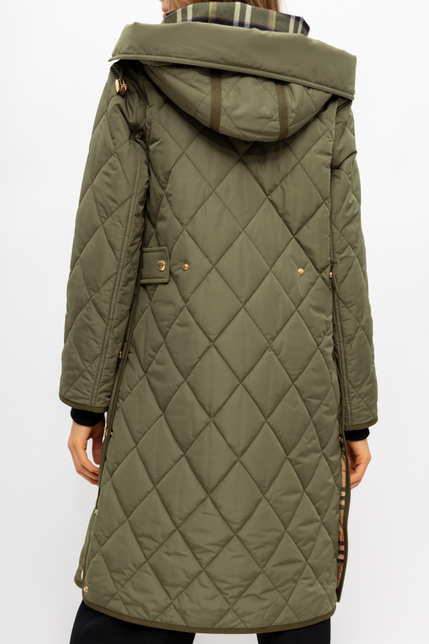 Green ‘Parkgate’ quilted coat from Burberry. Lined with the brand's signature colourful check pattern, this style features press-stud fastenings on the front and sides, a detachable drawstring hood, an additional two-way zipper with a beige leather puller, three slip pockets (one is embroidered with a logo), and long sleeves with piping.