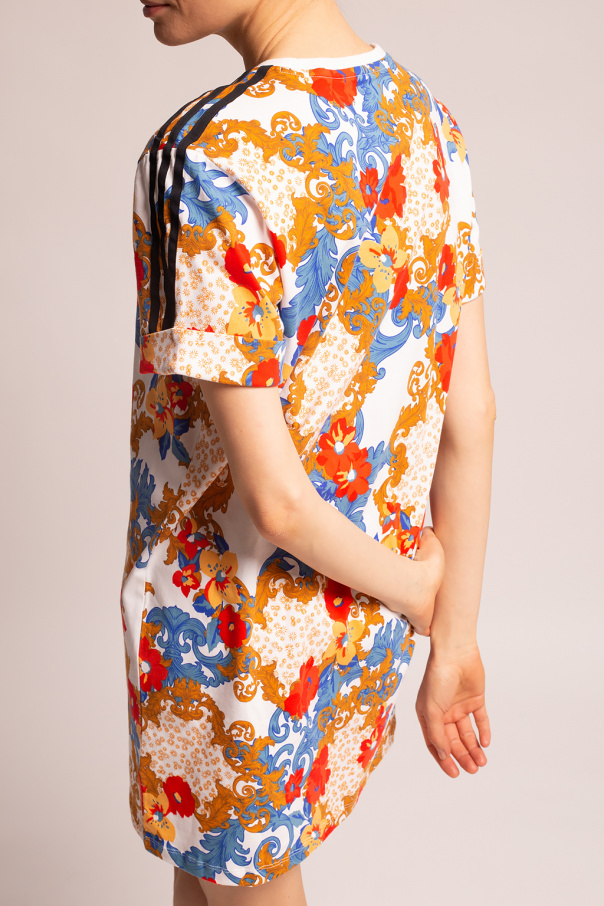Multicoloured crewneck T-shirt from ADIDAS Originals x HER Studio London. Crafted from cotton with a long length, this style showcases an all-over pattern, the brand's signature three stripes on the sleeves and an embroidered logo.