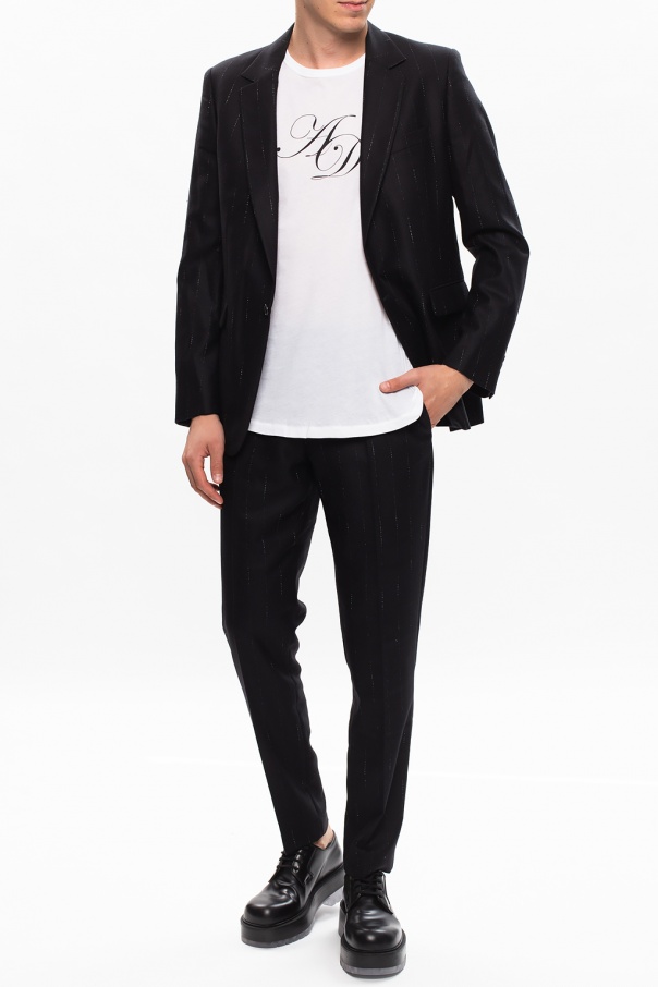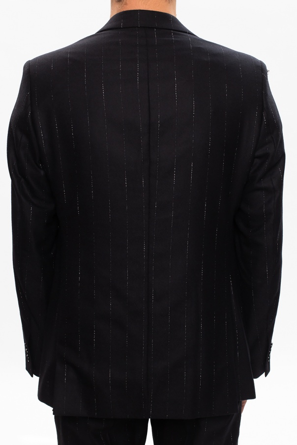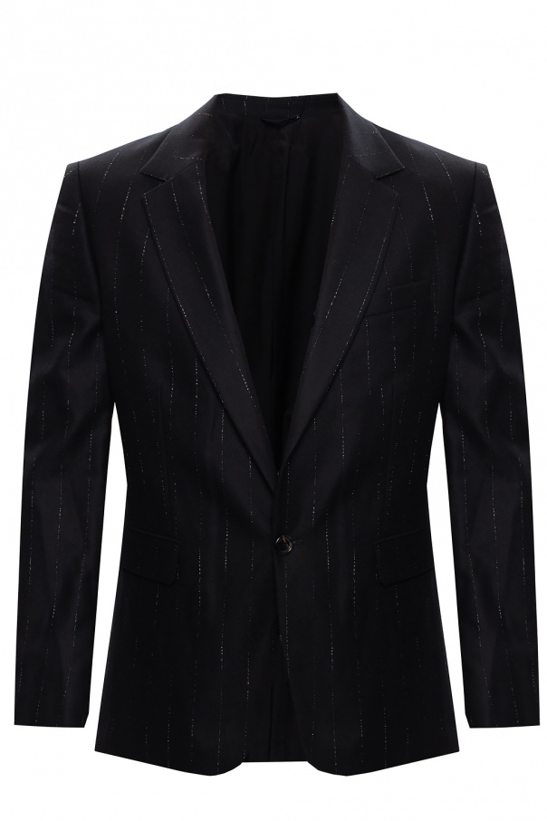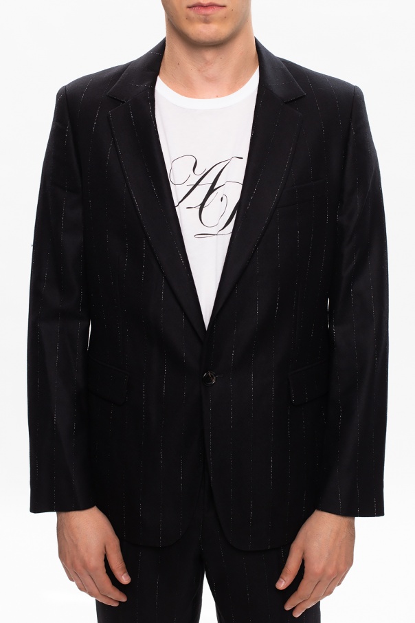Black blazer from Ann Demeulemeester. Crafted from wool, this style employs distinctive stitching details in contrasting white, single button closing, two flap pockets and one welt pocket.