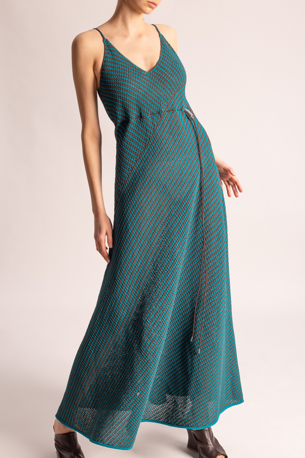 Blue and brown woven sleeveless dress from Bottega Veneta. Fastened with drawstrings, this design is decorated with a silver-tone appliqué.