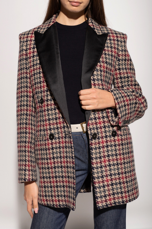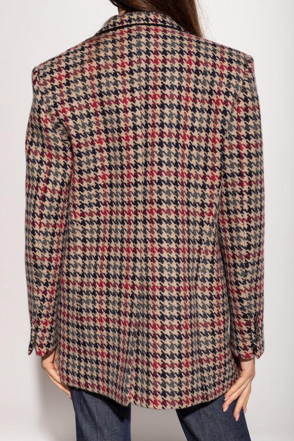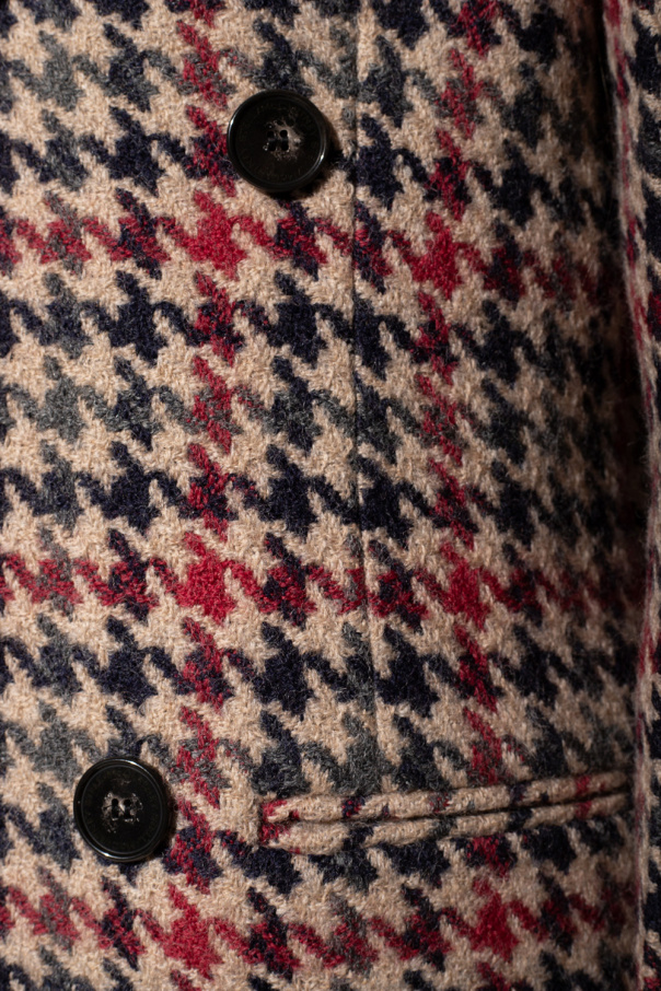 Beige blazer from Stella McCartney. Crafted from wool with an all-over houndstooth check pattern in navy blue, grey and red, this style features button fastenings, peak lapels, long sleeves, black satin piping, three frontal pockets and a single back vent.