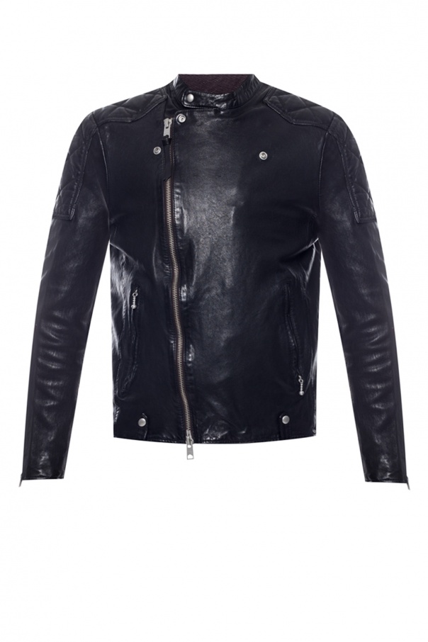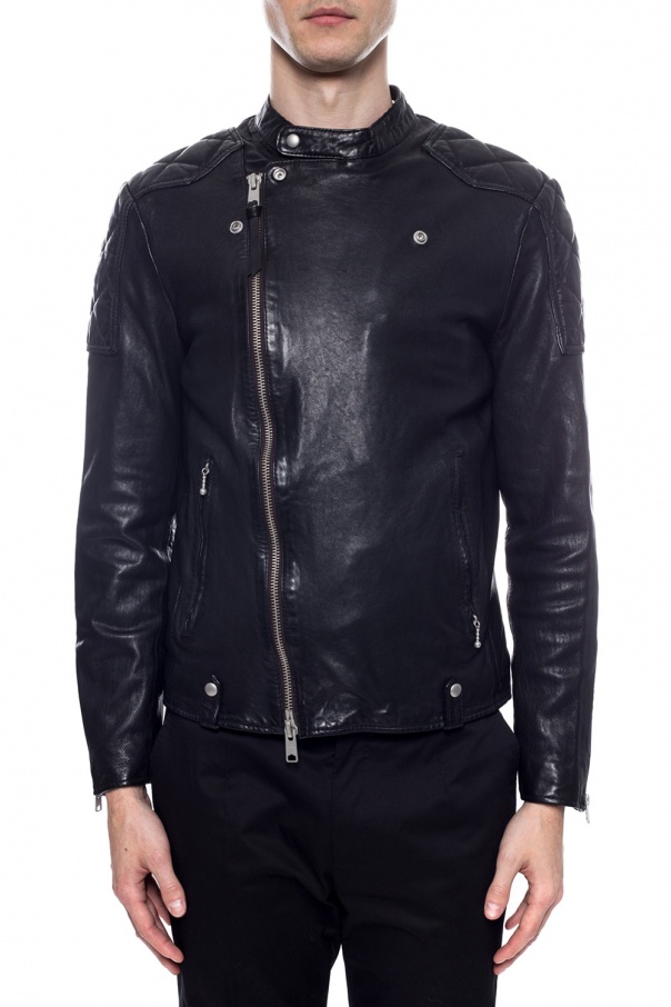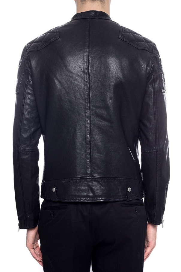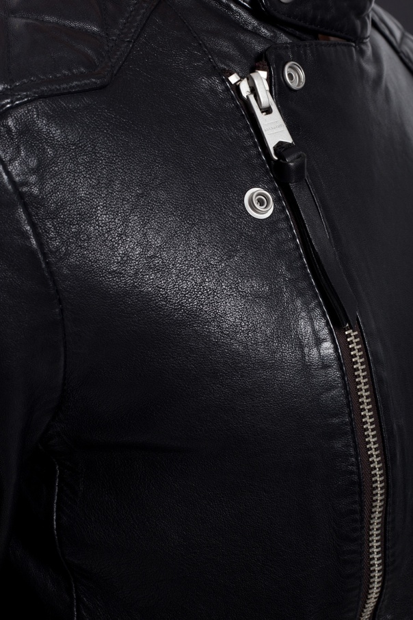 Black ‘Marley’ jacket with standing collar from AllSaints. Made of sheepskin. Fastened via zip. Features two zip pockets on the front and long sleeves with zipped vents.