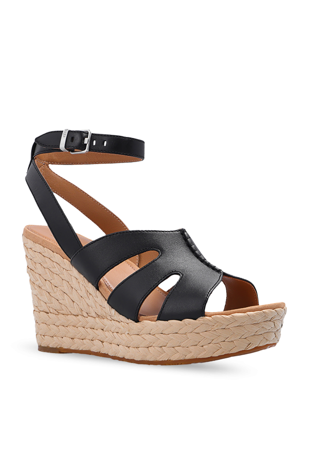Black ‘Careena’ wedge sandals from UGG. Made of leather, this model features an ankle buckle strap fastening, distinctive topstitched detailing on the front and a brown rubber sole with a beige raffia overlay.