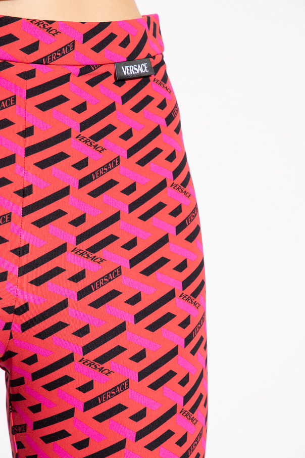 Red, pink and black Versace. Made of stretchy fabric, this pair features an elastic waistband, the brand’s signature La Greca pattern and logo patch.