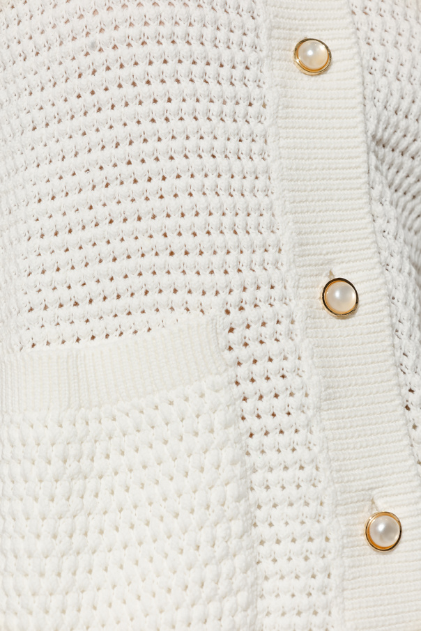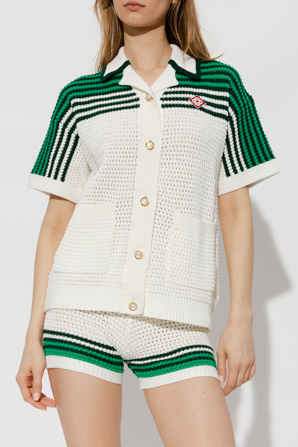 White and green shirt from Casablanca. Crafted from a soft open weave crochet cotton fabric, this style fastens with pearly buttons and showcases a stripe pattern. It is complete with a red logo patch, two slip pockets and elasticized trims on the short sleeves and bottom hem.