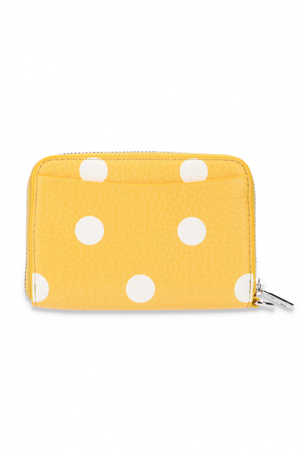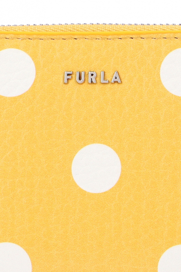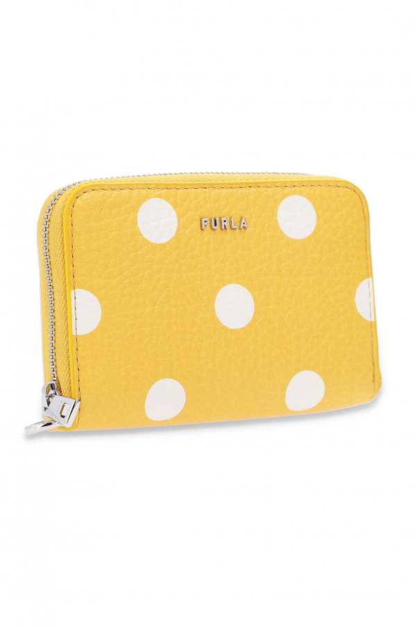 Yellow card holder from Furla. Crafted from leather, this design features a zip-around fastening, white polka dot pattern, metal logo, five internal card slots and silver-tone metal hardware.