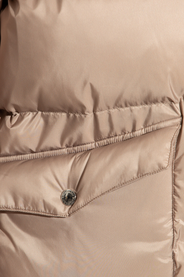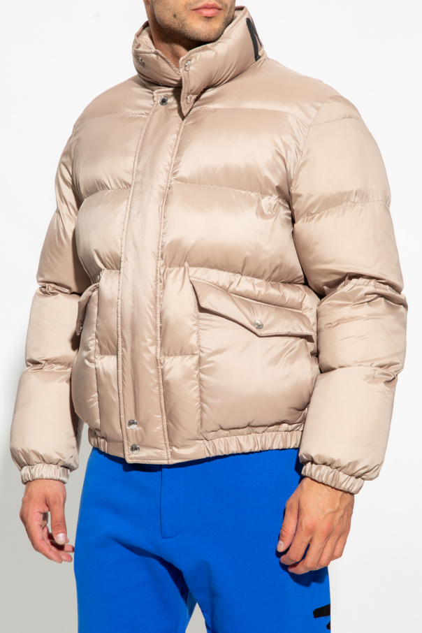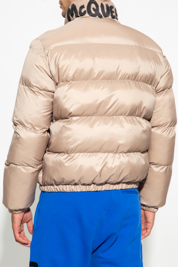 Beige insulated quilted jacket from Alexander McQueen. Decorated with a black ‘McQueen Graffiti’ logo print at the back, this garment is complete with a stand collar, snap and zip fastenings, two slip pockets, two snap-fastened flap pockets and ribbed trims at the hem and cuffs.