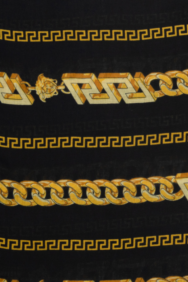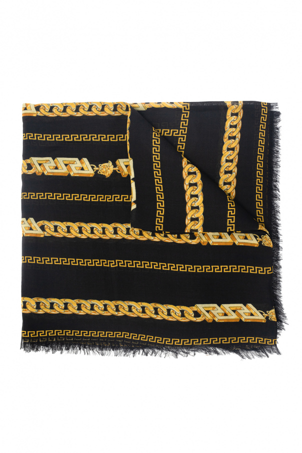 Black shawl from Versace. Made of a silk blend, this item features fringe detailing and a graphic pattern accompanied by the brand\'s logo in yellow and orange.