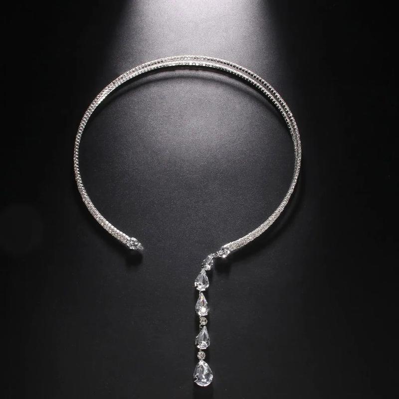 Чокер у вигляді кільця на шиї - модний аксесуар, створений для виділення та прикраси шиї. Це елегантне металізоване кільце, прикрашене блискучими стразами, виготовлене з щільного матеріалу, який тримає форму. Прикрашений звисаючою підвіскою (не знімною).