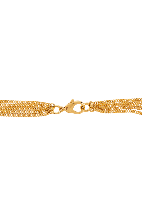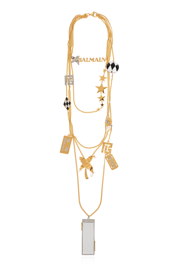 Introducing the Miami Necklace by Balmain, a statement piece that embodies the essence of luxury and sophistication. Crafted with meticulous attention to detail, this multi-layered necklace features a variety of chains, each varying in length and style, to create a rich, textured look that captivates and enchants. The necklace is adorned with an array of decorative elements, including sparkling crystals, coins, and tropical motifs like palm leaves, all set in gleaming, high-quality brass with a golden finish. The designer\'s logo, prominently displayed on one of the chains, alongside the prestigious \"BALMAIN\" inscription in an elegant font, acts as a hallmark of authenticity and prestige, elevating the piece to the realm of high fashion. Designed to be a versatile accessory, the Miami Necklace transitions seamlessly from casual ensembles to more formal attire, making it an indispensable addition to any wardrobe. Its clasp closure ensures ease of wear while contributing to the necklace\'s exquisite aesthetic. Why Purchase This Product? Exquisite Craftsmanship: Made entirely of brass, offering durability and a luxurious sheen. Iconic Design: Features Balmain\'s signature elegance, with unique elements that signify opulence. Versatility: Perfect for elevating any outfit, from daywear to evening attire. Distinctive Detailing: The combination of crystals, coins, and tropical motifs makes for an eye-catching piece. Designer Prestige: Carrying the BALMAIN name, it\'s a symbol of fashion-forward elegance.