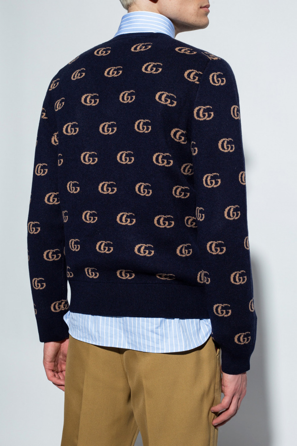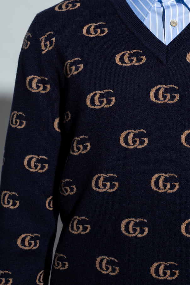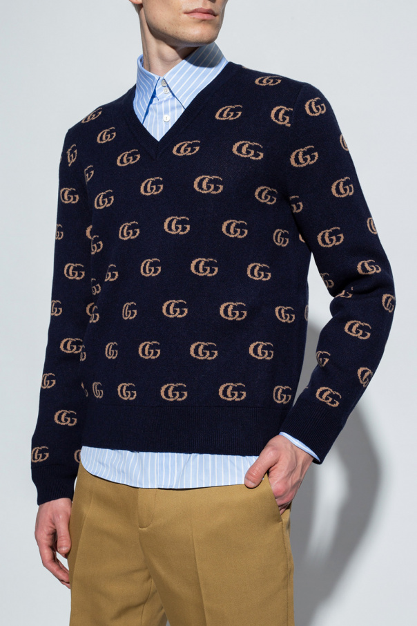 Navy blue sweater from Gucci. Crafted from a cashmere and wool blend, this style showcases a beige logo, a V-shaped neckline and ribbed edges.