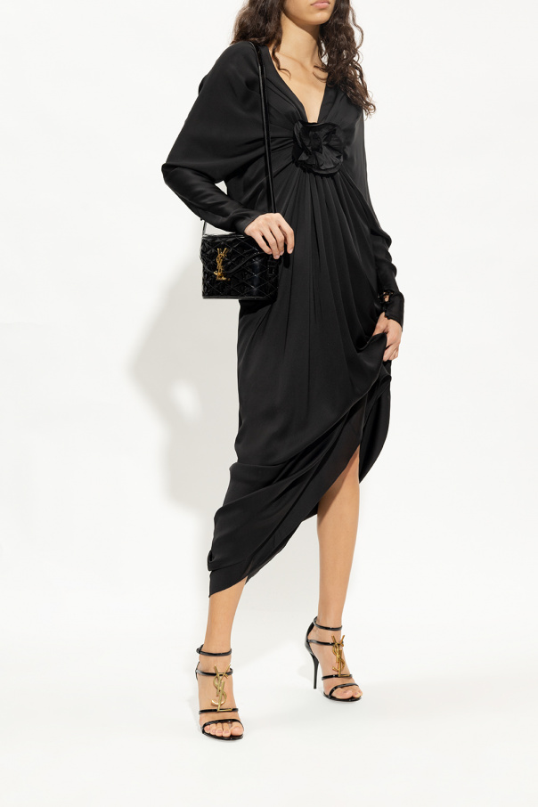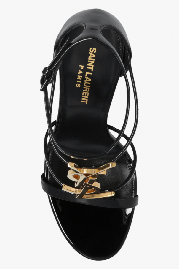 Black ‘Cassandra’ heeled sandals from Saint Laurent. Made of patent calf leather, this pair features adjustable buckled ankle straps, metal logo appliqué in gold-tone, round toe and black leather sole.