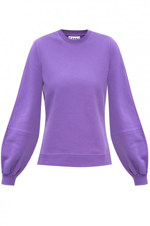 Purple crewneck sweatshirt from Ganni. Crafted from cotton jersey, this style showcases long sleeves with elasticated cuffs, vents to the sides and white logo embroidery on the back.