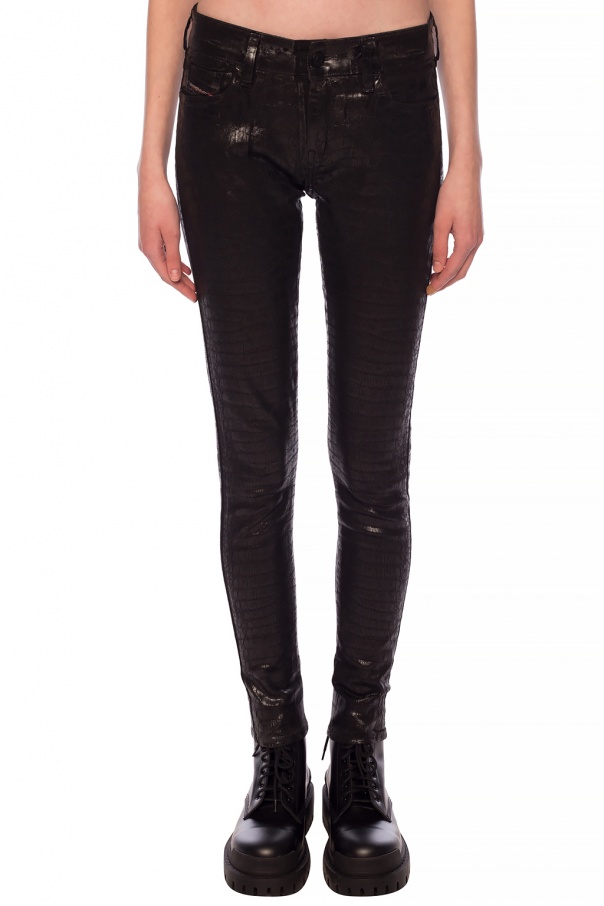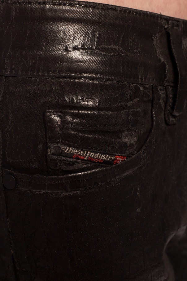 Black ‘Slandy’ skinny jeans from Diesel. Fastened via zip and button. Embellished with printed pattern. Feature 4 slip pockets and tapered legs.