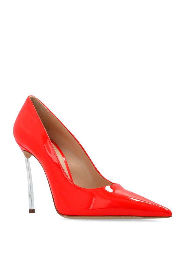 Neon red ‘Superblade Tiffany’ stiletto pumps from Casadei. Crafted from patent leather, this pointed toe pair features the brand’s signature stainless steel heel and a beige leather sole.