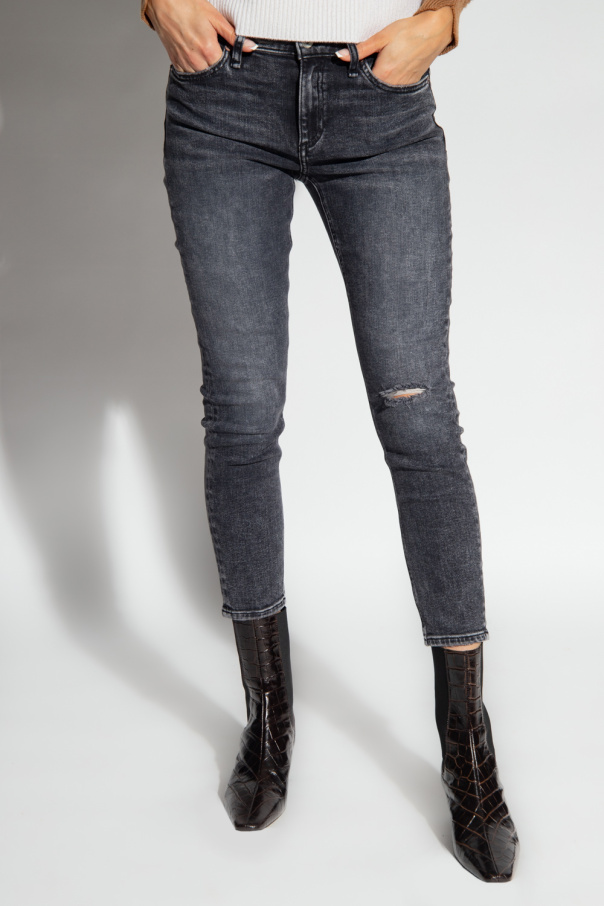 Dark grey skinny jeans from Rag & Bone. Falling with tapered legs, this pair features distressed detailing for a vintage effect, a zip fly with a button, classic five pockets and an embroidered logo at the back.