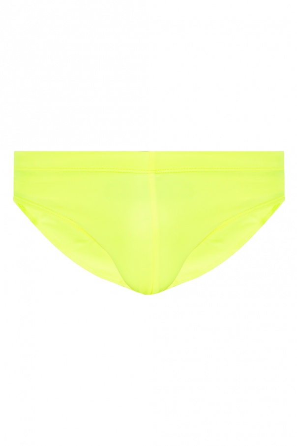 Yellow swim briefs from Diesel. Fastened with drawstrings, this item features a logo print in white and black.